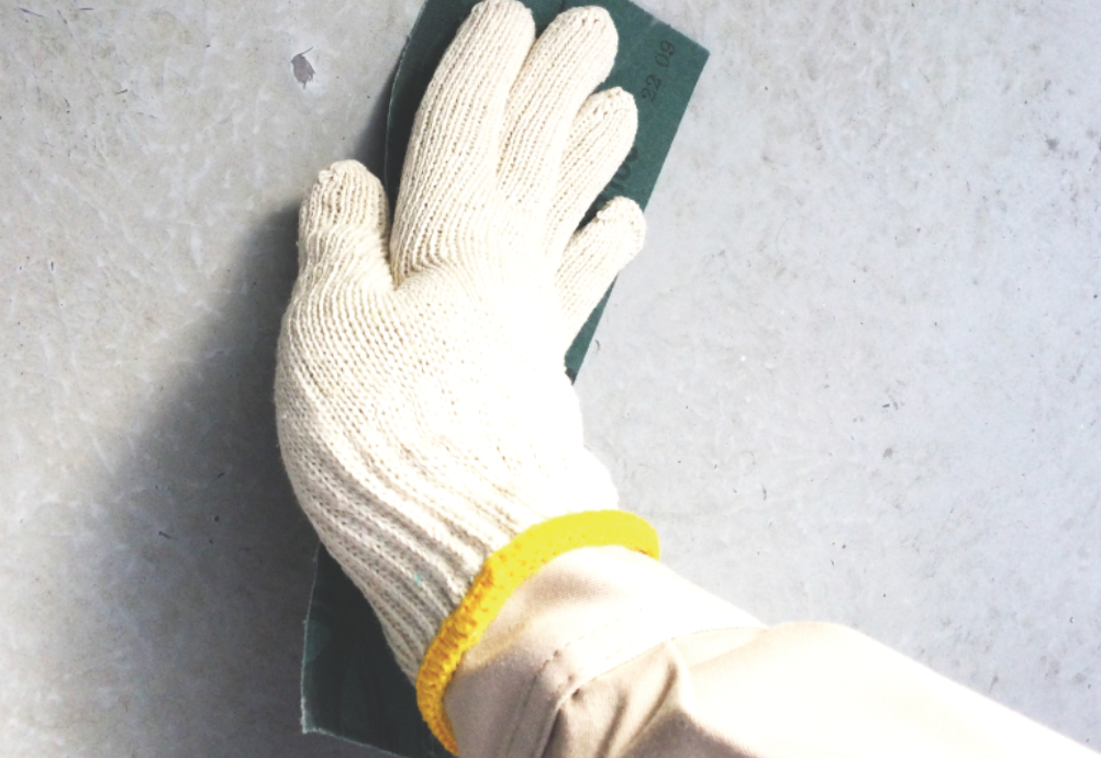 研磨で発生した粉じんを取り除き、ガイソーFRPクリーナー(アセトン)で全体を拭き取ります。