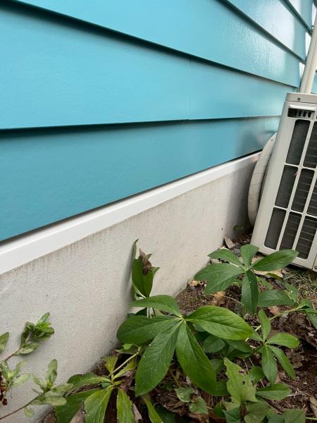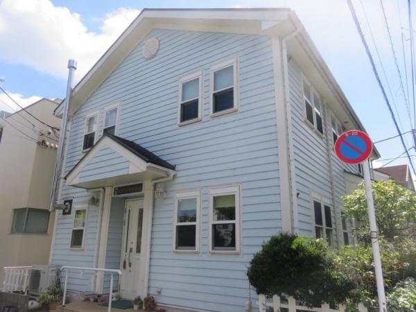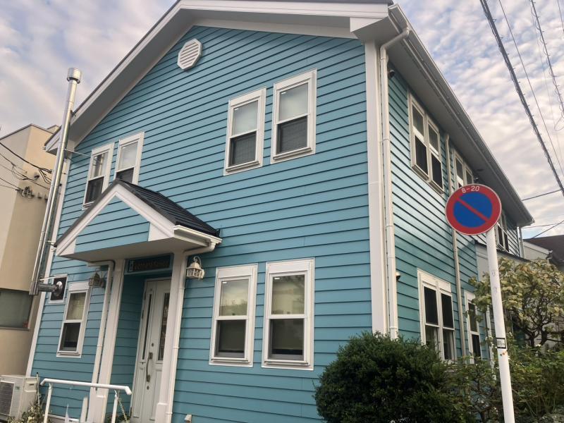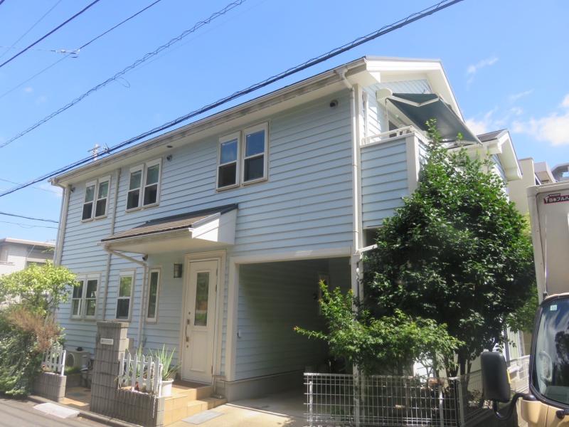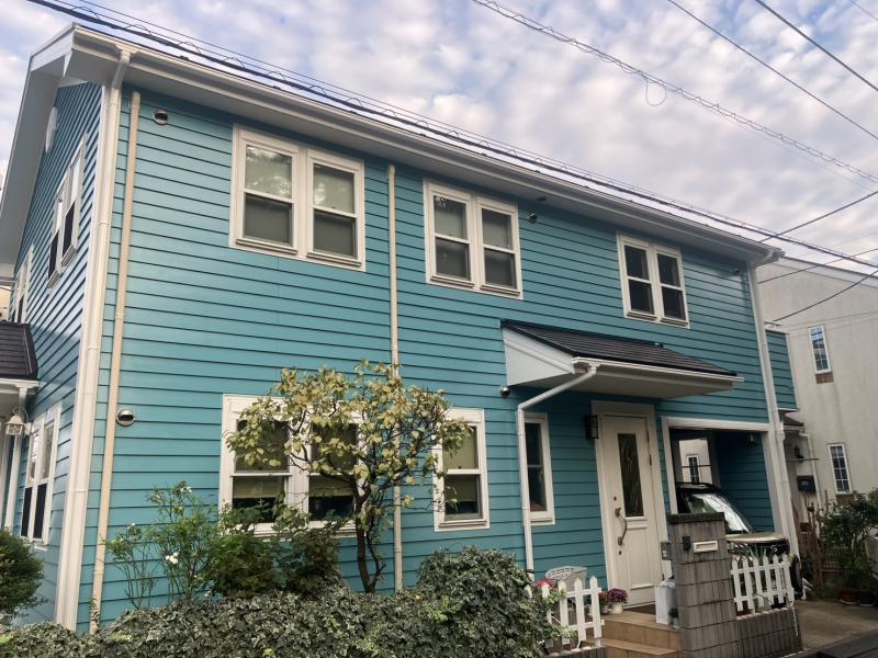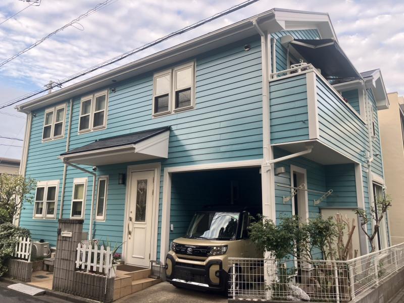 既存より濃い水色の外壁と、雨樋や窓枠、水切りなどの白い部分が良いアクセントに。