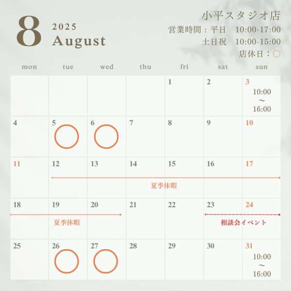 8月の営業日のお知らせ【ガイソー小平店|小平スタジオ店】