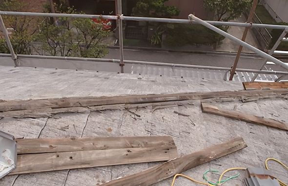既存の棟板金とその下地となっている木材を取り外します。撤去した後の、下地になっていた木材を見てみると、腐ってぼそぼそになってしまっていることが多いです。これは、新築してから年月が経つにつれ傷み始め、少しずつ雨水がまわってしまっていたためです。しかし、既存の屋根の下地に防水シートが使われていれば雨漏りすることはほとんどないため気づきにくいです。