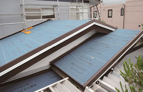 防水シートを貼ります。万が一新しい屋根材から雨がまわってしまっても、防水シートを貼っておけば雨漏りすることはないので安心です。防水シートにもいろいろな種類がありますが、お住まいの形状や工法も踏まえて、最も適した材料をご提案させていただきます。