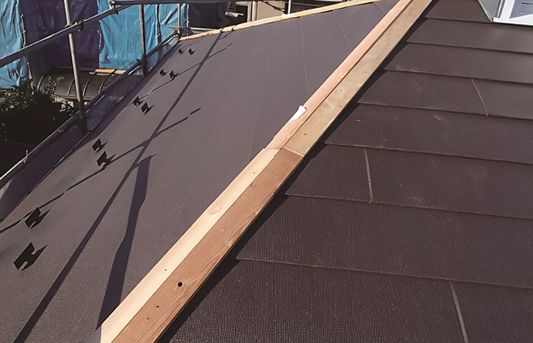 最後の仕上げとなる、棟板金の取り付けをします。下地となる木材をビス止めし、その上に板金をかぶせて固定します。屋根の美しさは棟で決まると言っても過言ではありません。板金の折り加工や納まりのきれいさで職人の腕がわかります。ガイソーには、熟練の腕利き職人が多数在籍しておりますのでご安心ください。