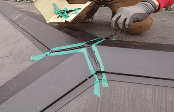 軒先から順番に本体を張っていきます。そのスタートになる軒先スターターや谷水切りなどの役物と呼ばれる板金を加工し取り付けます。